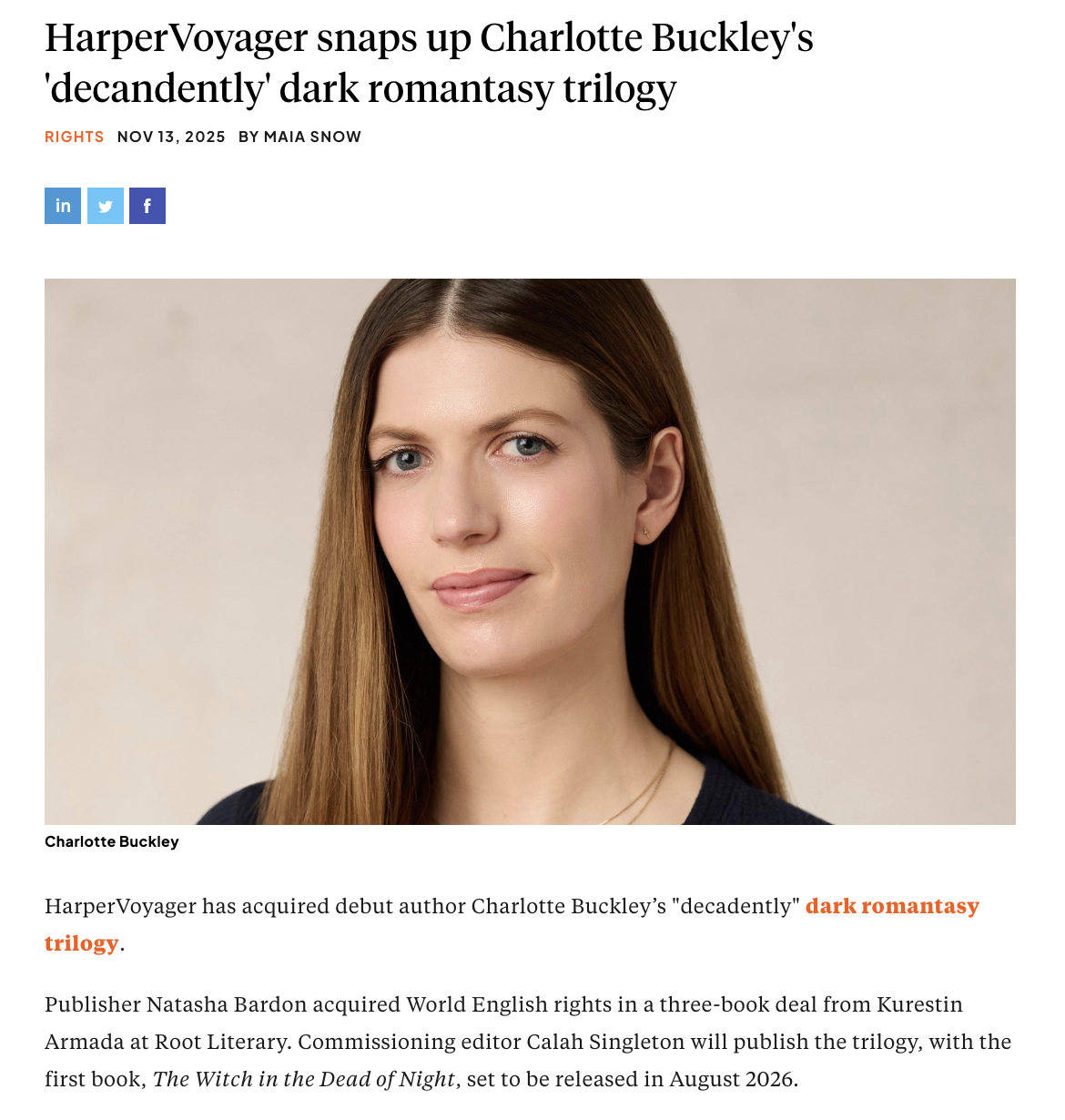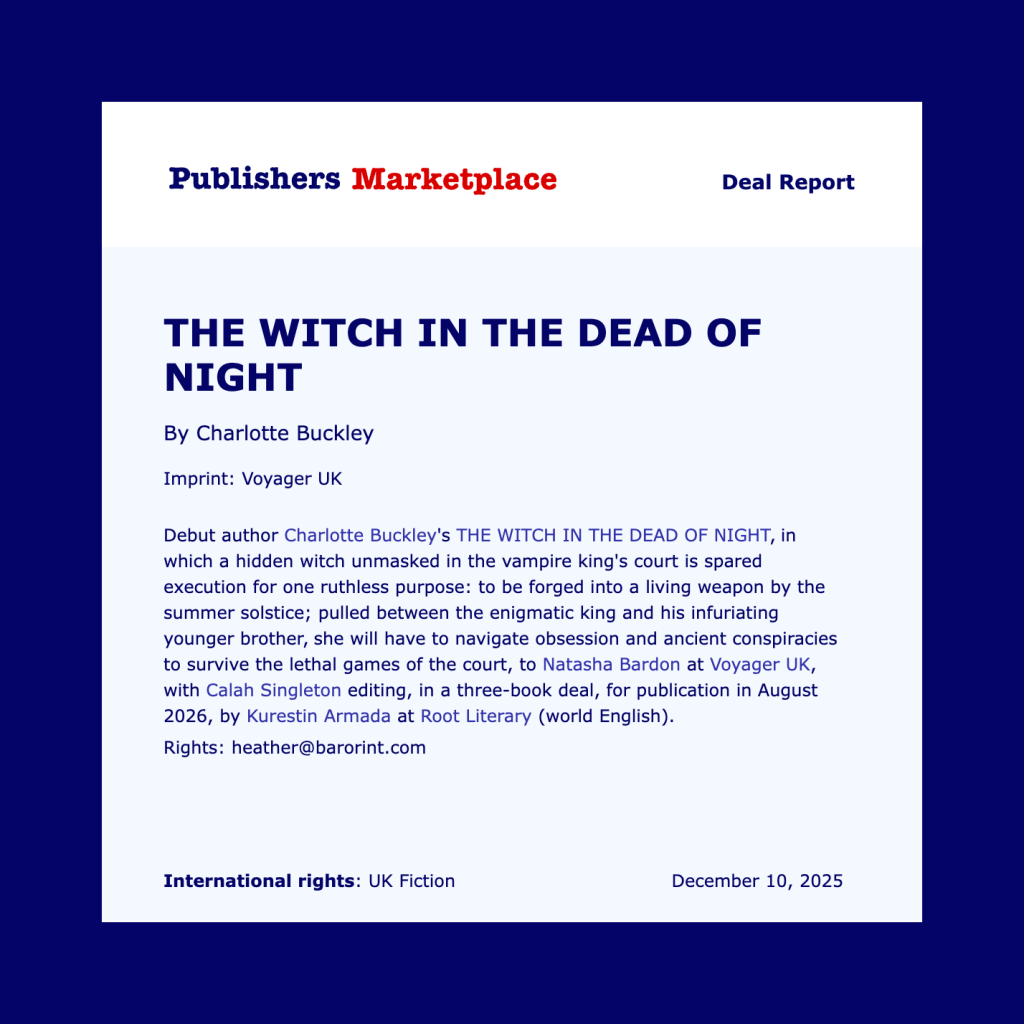 Charlotte’s debut novel, THE WITCH IN THE DEAD OF NIGHT, is coming August 2026 from HarperVoyager. Check out the details from The Bookseller.